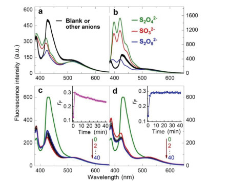 | Fig. 1. (a, b) Fluorescence responses of ABMP ([AnB] = 2.0 µmol/L) in aqueous solution buffered at pH 7.0 (by 0.02 mol/L Na2HPO4-NaH2PO4) upon addition of different amount (a, 0.10 mmol/L; b, 1.0 mmol/L) of Na2SO3, Na2S2O5, Na2S2O4, Na2S2O3, Na2S2O8, Na2SO4, CH3COONa, NaHCO3, Na2C2O4, NaNO2, NaNO3, NaSCN, Na2S, NaCl and NaI, respectively. (c, d) Time dependence of the fluorescence response induced by Na2SO3 (c, 10 µmol/L; d, 100 µmol/L) at 25 ℃. Excitation wavelength: 371 nm. Insets: plot of the emission intensity ratio (rF, at 514 nm/422 nm) vs. incubation time. | |