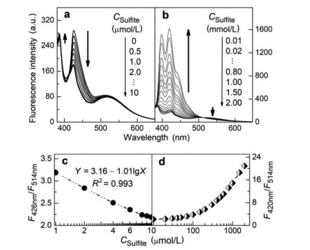 | Fig. 2. Fluorescence traces (a and b, emission spectra; c and d, ratiometric responses) of ABMP ([AnB] = 2.0 µmol/L) in aqueous solution at pH 7.0 in the presence of increasing amount of Na2SO3. Excitation wavelength: 371 nm. Incubation conditions: 37 ℃, 10 min. | |