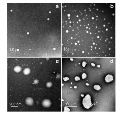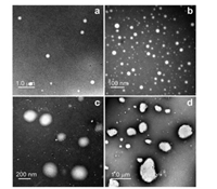 | Fig. 3. TEM images of ABMP ([AnB] = 2.0 µmol/L) formed in aqueous solution buffered at pH 7.0 in the presence of different amount of Na2SO3: (a) none, (b) 10 µmol/L, (c) 90 µmol/L, (d) 200 µmol/L. The images were obtained via negative staining of the samples by 2% tungstophosphoric acid. | |