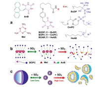| Scheme 1. (a) Chemical structures of the functional subunits investigated. Schematic illustration of (b) the SO2-induced degradation of the HB polymers formed by AnB, Mel and BOPC, and (c) the resulting morphology change of the self-assemblies in aqueous solution. | |