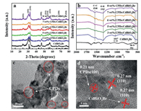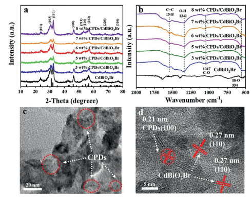 | Fig. 1. (a) XRD pattern and (b) FT-IR of the as-prepared CPDs/CdBiO2Br samples with different contents of CPDs; (c) TEM and (d) HRTEM images of the 6 wt% CPDs/CdBiO2Br hybrid materials. | |