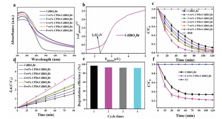 | Fig. 2. (a) UV–vis diffuse reflectance spectra of the as-prepared CPDs/CdBiO2Br hybrid materials; (b) (αEphoton)1/2 vs. Ephoton curves; (c) photocatalytic degradation of RhB under visible light irradiation; (d) kinetic fit for the degradation of RhB; (e) cycling runs for the photodegradation of RhB; (f) photocatalytic degradation of TC in the presence of pure CdBiO2Br, CPDs/CdBiO2Br hybrid materials under visible light irradiation. | |