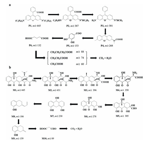 | Fig. 3. Possible pathways of photocatalytic degradation of (a) RhB and (b) TC by 6 wt% CPDs/CdBiO2Br. | |