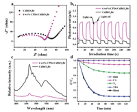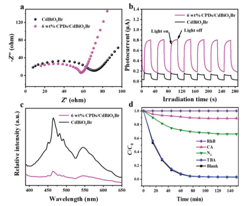 | Fig. 4. (a) EIS; (b) transient photocurrent response and (c) PL spectra of the as-prepared CPDs/CdBiO2Br hybrid materials and pure CdBiO2Br; (d) trapping experiment of active species during the photocatalytic degradation of RhB over CPDs/CdBiO2Br hybrid material under visible light irradiation. | |