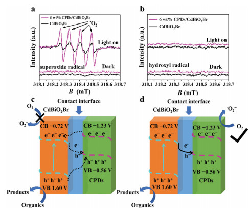 | Fig. 5. (a, b) ESR spectra of radical adducts trapped by DMPO in CPDs/CdBiO2Br hybrid materials aqueous dispersion under visible light irradiation. Energy band diagram of (c) traditional photocatalytic system and (d) direct Z-scheme photocatalytic system for the CPDs/CdBiO2Br composite material. | |