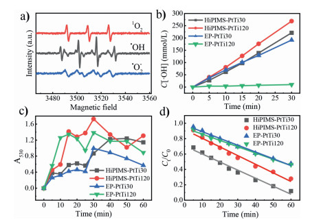The electron spin-resonance spectroscopy (ESR) for ROS generated during the electrocatalysis reaction is shown in Fig. 3a. There was not only 4-oxo-2, 2, 6, 6-tetramethyl-1-peridinoxy (TEMPO) produced by 1O2 in the system but also the production of •OH. The peak strength ratio of •OH was 1:2:2:1, corresponding to the spin adduct DMPO-•OH [44]. Also, •O2− was captured by DMPO in methanol solution, and six typical peaks of DMPO-•O2− signal appeared on ESR. Therefore, it can be assumed that ROS in the electrocatalysis system mainly included •OH, 1O2 and •O2−, acting together to degrade the typical pesticide in water. The production of •OH on the surface of four Pt/Ti anodes was measured. As shown in Fig. 3b, the yield of •OH concentration prepared by magnetron sputtering (HiPIMS-PtTi30, HiPIMS-PtTi120) was higher than that by electroplating (EP-PtTi30, EP-PtTi120). When the current density was 60 mA/cm2, the cumulative concentration on each anode within 30 min conformed to the quasi-zero order reaction kinetics [44].