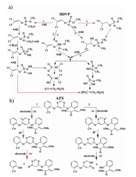 | Fig. 4. Potential reaction pathway of DDVP (a) and AZX (b) in electrocatalytic system. | |
