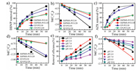 | Fig. 2. Electrocatalytic degradation of DDVP (a, b) and AZX (c, d) on HiPIMS-PtTi30, HiPIMS-PtTi120, EP-PtTi30, EP-PtTi120, and the effects of pH on degradation of DDVP (e, f) on HiPIMS-PtTi30. Current density 60 mA/cm2; [Na2SO4] = 22.5 mmol/L, d = 2 mm, [DDVP]0 and [AZX]0 10 mg/L; reaction volume: 500 mL. | |