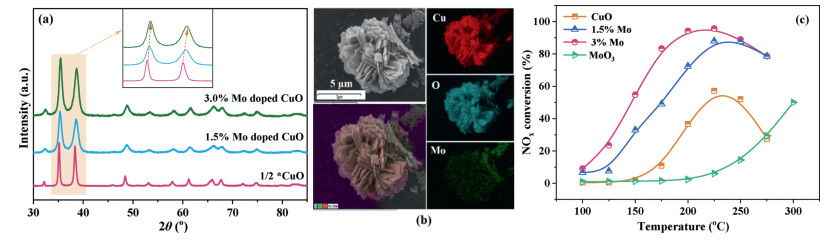 Therefore, in this study, we designed these Mo doped CuO samples which can combine the advantages of both species. It is found that this Mo doped CuO catalyst is more active than pure CuO catalyst even in the presence of SO2. According to the various characterization results, the cause of the promoting effect of Mo has been proposed, including structure, chemical and adsorption properties, and reaction mechanism. The synthesis procedure of Mo doped CuO samples, experimental methods, and characterization techniques are provided in Supporting information in detail.