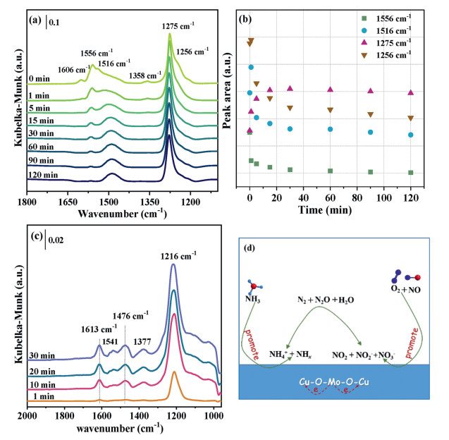 | Fig. 4. In situ DRIFT spectra of 3% Mo doped CuO catalyst during transient NH3 exposure after NO + O2 adsorption (a, b) or upon passing NH3 + NO + O2 over this catalyst (c) at 250 ℃ as a function of time; proposed mechanism of NOx reduction (d) over this Mo doped CuO catalyst. | |