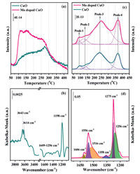 | Fig. 3. NH3-TPD (a) and NOx-TPD profiles (c) of Mo doped CuO samples. The DRIFT spectra of NH3 adsorption (b) and NOx adsorption (d) of 3 at% Mo doped CuO sample at 150 ℃. | |