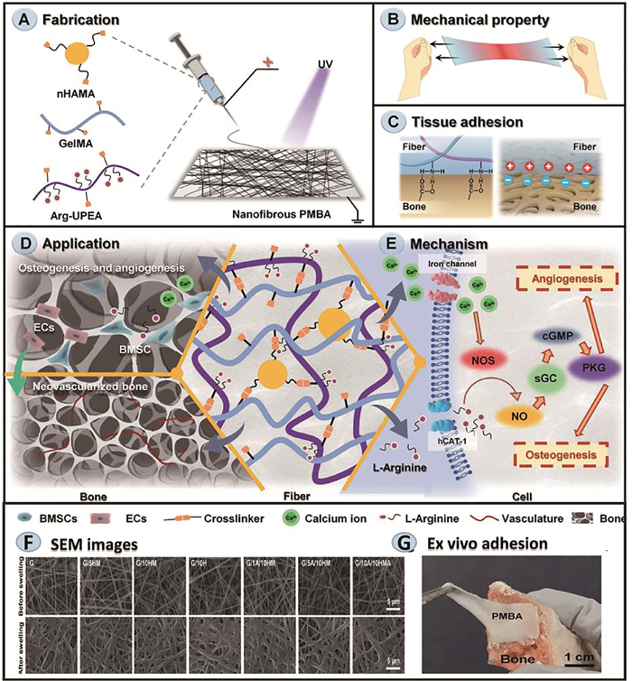 Fig. 6. An example of the fabrication, characteristics, mechanism, and application of adhesive electrospun fiber films. (A) The fabrication process of nanofibrous PMBA. (B) PMBA mechanical properties. (C) PBMA's superior adhesion performance. (D) A well-coordinated osteogenic–angiogenic coupling effect and accelerated bone regeneration caused by PMBA. (E) Activate/upregulate the NO–cGMP signaling pathway. (F) Representative SEM images of electrospun fiber films. (G) Illustrations of ex vivo adhesion of PMBA to the natural porcine bone. Reproduced with permission [98]. Copyright 2021, John Wiley and Sons. |