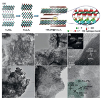 Fig. 9. (a) From left to right: the HF etching and exfoliation of Ti3C2Tx nanosheets, and the schematic illustration of TMLDHs assemble on Ti3C2Tx surface. The enlarged view indicating the hydrogen bond interaction between –F groups on Ti3C2Tx and –OH groups from TMLDH. (b) SEM image and (c) TEM image of the NiPS3@MXene nanosheets. (d) HRTEM of the NiPS3@MXene nanosheets. Insets show the SAED pattern. (e, f) TEM images of the Ni0.7Fe0.3PS3@MXene nanosheets. (g) The HRTEM of the Ni0.7Fe0.3PS3@MXene nanosheets. Reproduced with permission [118]. Copyright 2018, Wiley-VCH. |