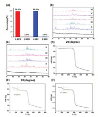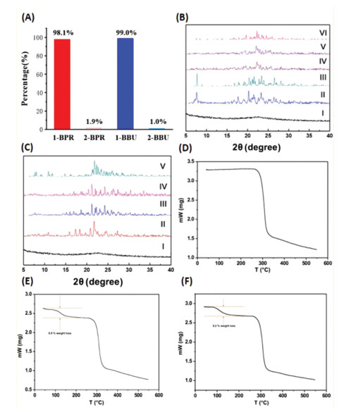| Fig. 2. (A) Relative amounts of 1- and 2-bromoalkane isomers adsorbed by BrP[5]L by GC. (B) PXRD patterns of BrP[5]L: (Ⅰ) original BrP[5]Lβ; (Ⅱ) after adsorption of 2-BPR vapor, (Ⅲ) simulated from the single-crystal structure of 2-BPR⊂BrP[5]L, (Ⅳ) after adsorption of 1-BPR vapor, (Ⅴ) after adsorption of the 1-BPR and 2-BPR mixture vapor, and (Ⅵ) simulated from the single-crystal structure of 1-BPR⊂BrP[5]L. (C) PXRD patterns of BrP[5]L: (Ⅰ) original BrP[5] Lβ, (Ⅱ) after adsorption of 2-BBU vapor, (Ⅲ) after adsorption of 1-BBU vapor, (Ⅳ) after adsorption of the 1-BBU and 2-BBU mixture vapor, and (Ⅴ) simulated from the single-crystal structure of 1-BBU⊂BrP[5]L. TGA analysis of (D) BrP[5]L, (E) BrP[5]L after sorption of 1-BPR vapor, (F) BrP[5]L after sorption of 1-BBU vapor. Reproduced with permission [1]. Copyright 2022, AAAS. | |