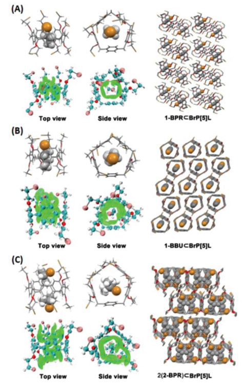 To discover the mechanism, they combined the single crystal structure with theoretical calculation and TG-DSC measurement. The results showed that one 1-bromoalkane was stably included in the cavity center of BrP[5]L through multiple intermolecular C—H···π, C—H···O, C—H···Br interactions. Different from the complex structure of 1-bromoalkane and BrP[5]L, the host-guest interaction region of BrP[5]L and 2-bromoalkane was mainly concentrated at the edge of pillarene cavity, and one BrP[5]L could complex two 2-bromoalkane molecules through weak host-guest interactions. Therefore, the adsorption selectivity was mainly due to the perfect host-guest matching of size and shape between BrP[5]L and 1-bromoalkane, leading to higher thermal stability compared with the corresponding 2-bromoalkane complex. Furthermore, the authors also demonstrated that the excellent adsorption selectivity of BrP[5]L benefited from the intrinsic free-rotation phenylene subunit on its backbone by control experiments using the corresponding traditional pillararenes.