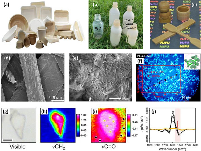 | Fig. 2. (a) Finished products from agricultural pulps, (b) biodegradable bottles made of PLA (left) and PLA + nanocellulose, and (c) samples of 3D printed objects at a high content (30 wt%) of nanocellulose in PLA. Scanning electron microscopy images of the surface morphologies of (d) molded pulp cups and (e) PLA + nanocellulose at different magnifications. Panels (a) and (b) were respectively provided by TPM-USA LLC (WI, USA) and Green Science Alliance Co., Ltd. Panels (c) and (e) were reproduced with permission [62]. Copyright 2017, Elsevier. Panel (d) was copied with permission [9]. Copyright 2020, Elsevier. (f) Optical microscopic image of PLA/cellulose nanofiber spherulite. Reproduced with permission [50]. Copyright 2017, American Chemical Society. Infrared absorbance maps and second derivative absorbance spectra of aggregate particles of nanocellulose in PLA matrix: (g) visible light image of particles, (h) ν(CH2) absorption map, (i) integrated ν(C═O) second derivative absorption peak area and (j) inverted second derivative absorption spectra of ν(C═O) stretching peak for locations indicated by orange and black markers in panel (i). Copied with permission [52]. Copyright 2017, Springer Nature. | |