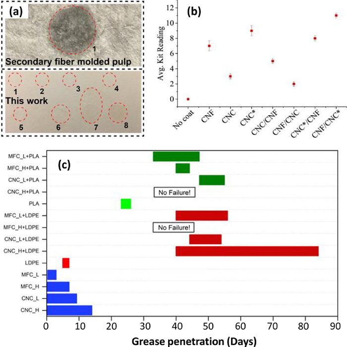 | Fig. 5. (a) Images that compare oil resistances of different molded pulp tableware. Reproduced with permission [9]. Copyright 2020, Elsevier. (b) The effects of cellulose nanofiber (CNF) and cellulose nanocrystal (CNC) coatings on the oil and grease resistance. Copied with permission [76]. Copyright 2019, Elsevier. (c) Grease penetration rates for different coatings. MFC stands for microfibrillated cellulose. L and H are low and high coating grammages. Copied with permission [77]. Copyright 2019, American Chemical Society. | |