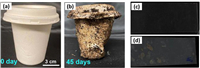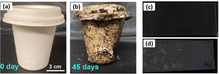 | Fig. 6. Photo images of (a) new molded pulp tableware and (b) that after 45 days of soil burial. Reproduced with permission [9]. Copyright 2020, Elsevier. Physical changes to PLA coupons (c) before soil burial and (d) that after 1 year burial at 37 ℃ in soil. Copied with permission [91]. Copyright 2013, Elsevier. | |