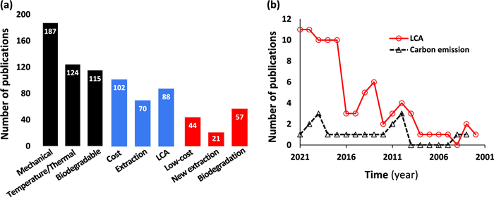 To visualize the representation of these important issues in the state-of-knowledge, an unofficial Web of Science search of the literature (from 2000 to 2021) on topic of "Agricultural Waste Packaging" was performed (Fig. 7a). Among the 803 results from the Core Collection, it is not surprising to find broad research interest on the properties of the products including "Mechanical", "Temperature/Thermal" and "Biodegradable". As a result, critical performance indicators have been proposed for the sustainable food packaging, and continuous studies are required to further improve the mechanical strength, thermal stability and biodegradability of the agricultural waste-based products. In comparison, while a few recent studies in this area are devoted to addressing the challenges related to "Cost", "Extraction" and "Life-cycle assessment" (Fig. 7a), investigations on more specific topics such as "Low cost/cost-efficient", "New/novel extraction" and "Biodegradation" are scarce. Unless otherwise stated, it is expected that the pulp preparation and product production (molding process) contribute to the highest environmental impact in the life cycle. Based on the surveyed literature, it is suggested that more work is needed for (1) advanced design and production technologies to develop viable packaging materials and (2) sustainable process management to minimize the negative impacts on the environment. Moreover, research on renewable materials and energy is inevitably influenced by external factors (e.g., political and economic factors). Renaissance in evaluation of the carbon footprint involved in agricultural waste-based products (Fig. 7b) may result from the aggravated concern on climate change and ambition of achieving carbon neutrality.