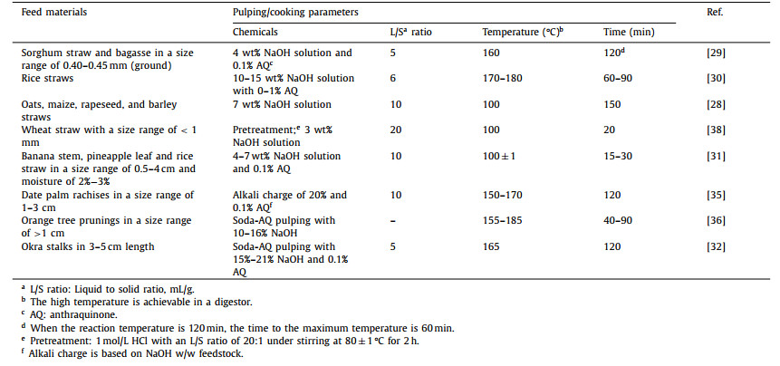 Table 1 Summary of the parameters of pulping/cooking processes to prepare agricultural pulp. |