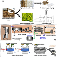 | Fig. 1. (a) Agricultural cellulosic waste for production of sustainable food delivery packaging. (b) A typical workflow to prepare non-wood pulps as a host material. (c) Solvent-casting and melt methods to prepare composite master batch that contains agricultural cellulose as a guest material. TPS: Thermoplastic starch. PLA: Polylactic acid. | |