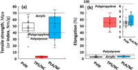 | Fig. 3. Summary of (a) tensile strength and (b) elongation at break among pulp products, thermoplastic starch + nanocellulose (TPS/NC) and polylactic acid + nanocellulose (PLA/NC). Assume that the densities of most pulp products are around 1 g/cm3, i.e., 1 MPa is equivalent to 1 N m/g. The dash lines represent the tensile strength and elongation at break of typical polymers (e.g., polypropylene, polystyrene and acrylic). Data were retrieved from refs. [28, 29, 31, 42, 46. 50. 51, 53]. | |
