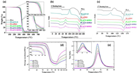 | Fig. 4. (a) TG curves and DSC thermograms obtained from the (b) first and (c) second heating scan of PLA, PLA/CF, PLA/PEO and PLA/CF/PEO composites. PLA, CF and PEO stand for polylactic acid, cellulosicfibers and poly(ethylene oxide), respectively. The inset in panel (a) is the zoom-in of the TG curves from 250 to 275 ℃ and from 325 ℃ to 425 ℃. Reproduced with permission [56]. Copyright 2020, American Chemical Society. Representative DMA curves of PLA composites: (d) storage modulus and (e) tanδ. CNC and e-CNC stand for cellulose nanocrystals and esterified cellulose nanocrystals, respectively. Copied with permission [53]. Copyright 2019, Springer Nature. | |