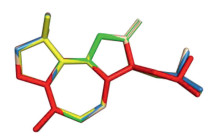 | Fig. 2. Overlays of DMAMCL molecular conformations (red, DMAMCL-23DBA; green, DMAMCL-24DBA; yellow, DMAMCL-25DBA; wheat, DMAMCL-34DBA; skyblue, DMAMCL-35DBA). | |