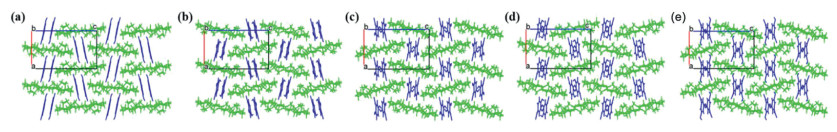 | Fig. 3. Packing view of (a) DMAMCL-23DBA, (b) DMAMCL-24DBA, (c) DMAMCL-25DBA, (d) DMAMCL-34DBA and (e) DMAMCL-35DBA in the ac plane. | |