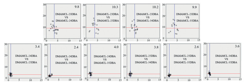 The values of the unit cell similarity index (π) [29] and mean elongation (ε) [30] were calculated and found to be close to zero (Table S4 in Supporting information), which further supports the isostructurality. DMAMCL-24DBA and DMAMCL-25DBA have the highest similarity on the basis of the smallest values of π and ε. We speculate that this is mainly because the molecular volumes and shapes of 24DBA and 25DBA are the closest. Furthermore, the relatively low values of PSab (0.2~1.6, Fig. S12 in Supporting information) obtained from CrystalCMP software show that the packing of DMAMCL is similar in all the obtained salts, which is consistent with the crystal structure analysis. Based on the similarity of geometric parameters of different structures, the Xpac program was used to identify and compare the possible molecule packing similarity in 0D/1D/2D/3D dimensions [31]. The XPac dissimilarity index value is between 2.0~10.5 (Fig. 4). Such small values are indicative of 3D isostructurality between each pair of crystal structures of the corresponding DMAMCL salts. Comparatively speaking, the dissimilarity index values are larger for four pairs (9.8 for DMAMCL-23DBA and DMAMCL-24DBA; 10.3 for DMAMCL-23DBA and DMAMCL-25DBA; 10.2 for DMAMCL-23DBA and DMAMCL-34DBA; 9.9 for DMAMCL-23DBA and DMAMCL-35DBA), which indicates that they have smaller packing similarity. This is mainly due to steric hindrance of 23DBA, and the difference in the position of functional groups will further lead to a change in their roles in the assembly of multicomponent crystal molecules. In addition, the calculated PXRD similarity index values are between 0.97 and 0.99 (Table S5 in Supporting information) suggesting that the five DMAMCL salts are 3D isostructural, which is consistent with the conclusions obtained by other similarity analysis methods.
