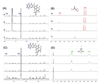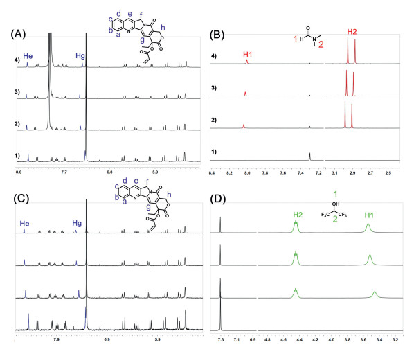 | Fig. 1. Partial 1H NMR spectra of CPT-A (400 MHz, CDCl3, 298 K) after the addition of DMF (A, B) and HFPOH (C, D). (1) 500:0, (2) 495:5, (3) 490:10, and (4) 485:15 (CDCl3: DMF, v/v). | |