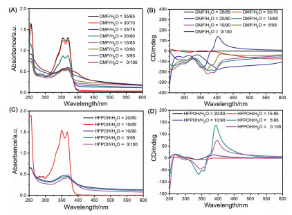 | Fig. 2. UV-vis spectra of CPT-A in the mixed solution of DMF and H2O (v/v) (A) and HFPOH and H2O (v/v) (C). CD spectra of CPT-A in the mixed solution of DMF and H2O (v/v) (B) and HFPOH and H2O (v/v) (D). The 10 µL CPT-A solution in DMF ([CPT-A] = 20 mg/mL) was added to the above-mixed solution, and the final CPT-A concentration was determined to be 0.067 mg/mL. | |