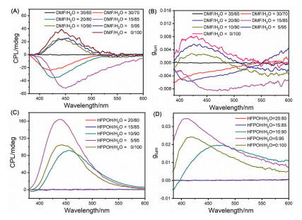 | Fig. 3. (A) CPL spectra and (B) glum factor profiles of CPT-A in the mixed solution of DMF and H2O (v/v). (C) CPL spectra and (D) glum factor profiles of CPT-A in the mixed solution of HFPOH and H2O (v/v). The 10 µL CPT-A solution in DMF ([CPT-A] = 20 mg/mL) was added to the above mixed solution, and the final CPT-A concentration was determined to be 0.067 mg/mL. | |