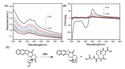 | Fig. 4. (A) UV-vis spectra and (B) CD spectra of CPT-A after the addition of GSH. (C) Proposed reaction formula between CPT-A and GSH. The 10 µL CPT-A in DMF solution ([CPT-A] = 10 mg/mL) was added to water (3 mL), and the final CPT-A concentration was determined to be 0.033 mg/mL. | |