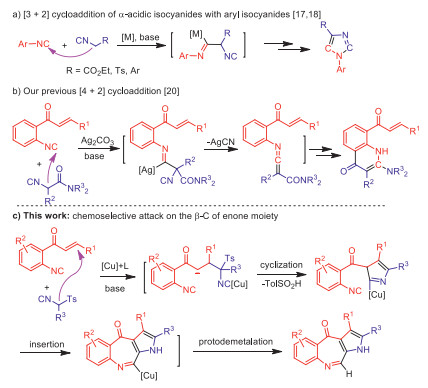 During the past decade, dimerization of two isocyanides has proven to be an efficient and useful tool for the construction of nitrogen-containing heterocycles [12-21]. In this context, the cycloaddition of α-acidic isocyanides with another aryl isocyanides has drawn considerable attention (Scheme 1) [16-21]. In 1999, Grigg and co-workers firstly disclosed the homo-cycloaddition of isocyanoacetate to produce imidazoles [16]. Six years later, an elegant cross-cycloaddition of aryl isocyanides with α-acidic isocyanides was achieved by the group of Yamamoto for catalytic synthesis of imidazoles (Scheme 1a) [17]. After that, Hong's [18] and Bi's [19] groups independently extended this reaction for preparation of 1, 4-diaryl- and 1, 4, 5-trisubstituted imidazoles (Scheme 1a). Recently, we found a [4 + 2] rather than [3 + 2] cycloaddition with α-substituted isocyanoacetamides and aryl isocyanides to access fused pyridones (Scheme 1b) [20]. Mechanistically, the above isocyanide-based [3 + 2] and [4 + 2] cycloadditions are all initiated by the nucleophilic attack of α-carbanion to the other isocyano group. Thus, the new reactivity profiles of these two isocyanides are still needed to explore for the divergent heterocycle syntheses. In continuation of our studies on isonitrile chemistry [22-25], we herein report a copper-catalyzed chemoselective heterocycloaddition of two different isocyanides for the synthesis of benzopyrroloazepinones (Scheme 1c). Unlike the previous isocyanide-based [3 + 2] and [4 + 2] reactions [20], this domino transformation is triggered by the chemoselective attack of substituted tosylmethyl isocyanides (sTosMIC) to the C=C double bond of o-cinnamoyl arylisocyanides. Notably, the azepinone ring is formed by an isocyanide insertion into the C–Cu bond of the in situ generated transient pyrrolocuprate intermediate.