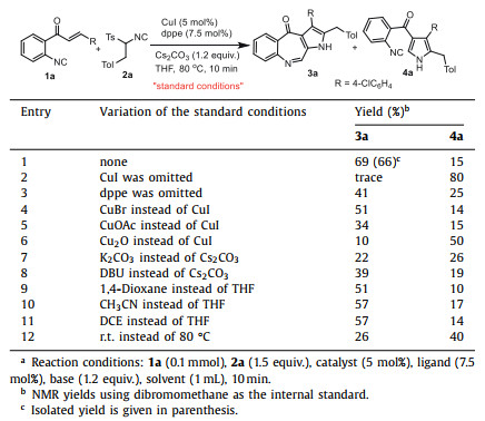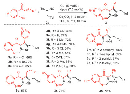 Initially, o-cinnamoyl phenylisocyanide 1a and sTosMIC 2a was chosen as the model substrates to screen the reaction conditions (Table 1, for more details, see Supporting information). When 1a (0.1 mmol) and 2a (1.5 equiv.) was treated with CuI (5 mol%), dppe (7.5 mol%), and Cs2CO3 (1.2 equiv.) at 80 ℃ in THF for 10 min, benzopyrroloazepinone 3a (CCDC: 2124660) was obtained in 69% yield and the van Leusen-type pyrrole [26, 27] 4a in 15% yield (Table 1, entry 1). Only 80% yield of 4a was obtained without CuI (Table 1, entry 2), and the yield of 3a decreased to 41% without 1, 2-bis(diphenylphosphino)ethane (dppe) (Table 1, entry 2). Then, we screened the copper catalyst and found that other copper catalyst such as CuBr, CuOAc, and Cu2O gave a lower yield of 3a (Table 1, entries 4–6). It was showed that Cs2CO3 was more effective than DBU and t-BuOK (Table 1, entry 1 vs. entries 7 and 8). Solvent screening revealed that THF was the best choice (Table 1, entries 1 and 9–11). When the temperature was dropped to r.t., the yield of 4a was decreased obviously (Table 1, entry 12).