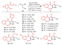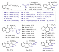 | Scheme 2. Scope of o-cinnamoyl arylisocyanide 1. Reaction conditions: 1a (0.2 mmol), 2a (1.5 equiv.), CuI (5 mol%), dppe (7.5 mol%), Cs2CO3 (1.2 equiv.), THF (2 mL), 10 min. Isolated yields of 3, and the reactions gave the corresponding pyrroles 4 in 10%−20% yields. | |