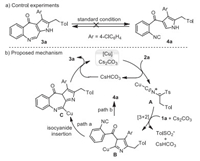 To figure out the mechanism, control experiments were executed (Scheme 5a). Under the standard conditions, pyrrole 4a and fused azepinone 3a could not convert to each other. This result demonstrates that the seven-membered azepinone ring is stable and the pyrrole 4a is not an intermediate for the formation of azepinone 3a. Based on the above experimental results and preceding studies [28-32], we proposed a conceivable mechanism (Scheme 5b, exemplified by the formation of 3a). First, coordination of CuI to isocyanide 2a, followed by the abstraction of a proton, forms a dipolar copper complex A [17, 28]. A formal [3 + 2] cycloaddition of intermediate A with the C=C double of isocyanide 1a occurs to generate the pyrrolocuprate intermediate B [29]. Then, isocyanide insertion into the C–Cu bond (path a) [28, 30-32] produces organocuprate C with construction of the seven-membered azepinone ring. Finally, the sequentially protodemetalation and aromatization result the final product 3a. The byproduct 4a is produced by protodemetalation of pyrrolocuprate intermediate B (path b).