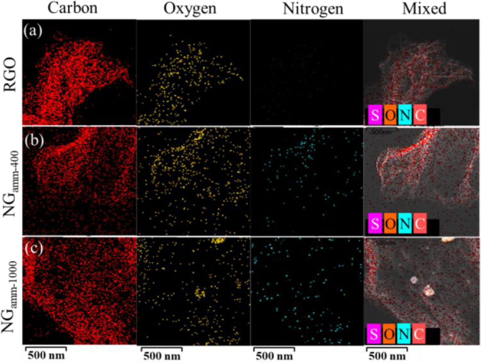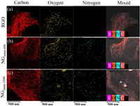 | Fig. 1. STEM mapping images including C, O, N, and composite image for (a) RGO, (b) NGamm-400, and (c) NGamm-1000 samples, respectively. | |