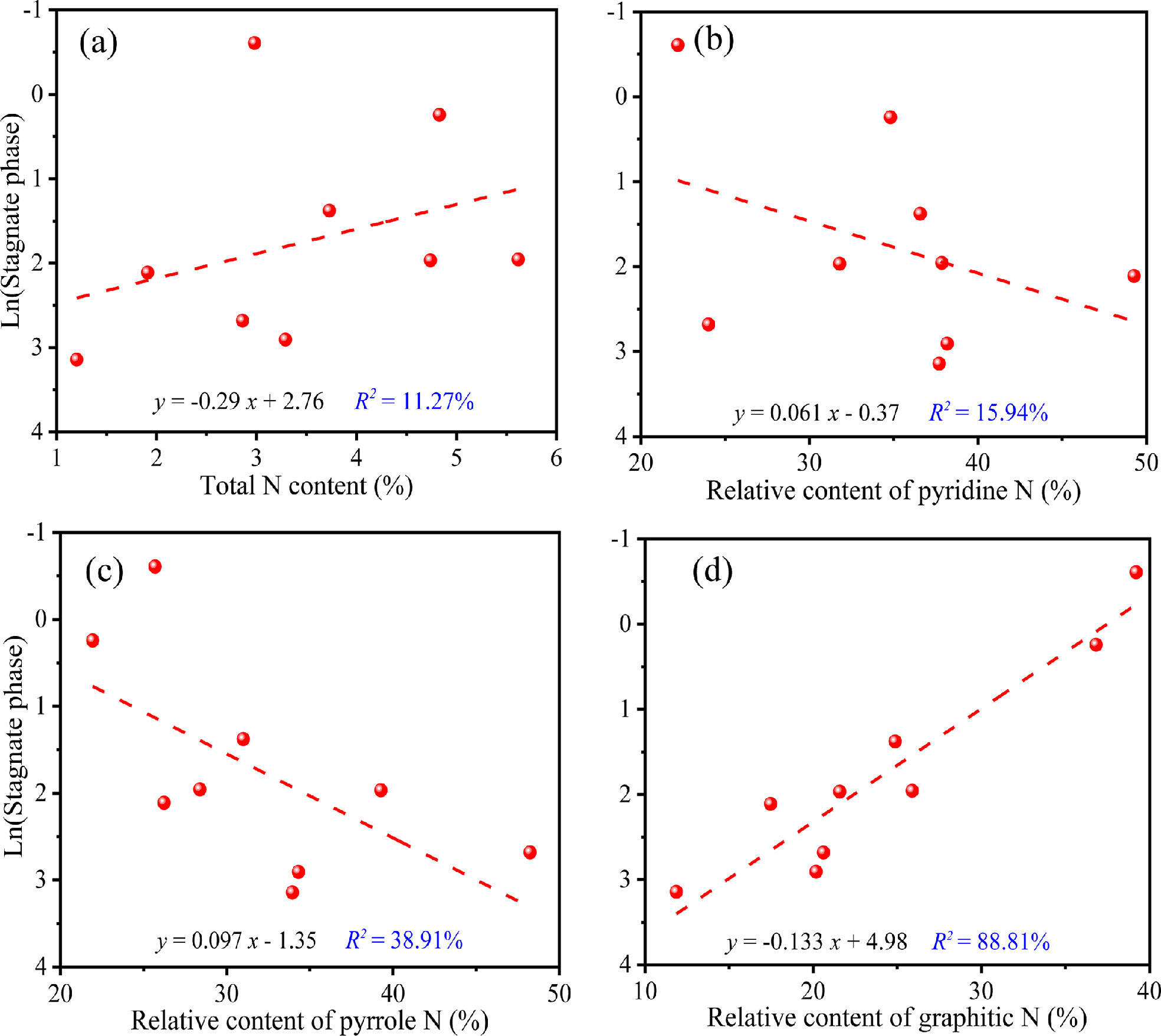 To understand which nitrogen species may play a role in NG-mediated MO decolorization by sulfide, the correlation between reaction stagnate phase time and N species content, including total N, graphitic N, pyridine N and pyrrole N, were further explored. As shown in Fig. 2, an evident negative linear correlation between the logarithm of the stagnate phase and the relative content of graphitic N is obtained (R2 = 88.82%). However, there is no apparent linear correlation between the logarithm of the stagnate phase and contents of total nitrogen, pyridine N, and pyrrole N species, as the R2 values were below 50%. This result implies that graphitic N would likely be most important in NG-mediated MO decolorization by sulfide. Differently, Ding et al. indicated that pyridine N might play an important role in the trichloroethylene dechlorination by sulfide (R2 = 97%) [18]. One of reasons to cause this difference may be owing to the different organic pollutants, in which the dechlorination of trichloroethylene in Ding's study while azo dye decolorization in our work. However, the impact of graphitic N on the dechlorination of trichloroethylene could not be excluded in the study from Ding et al., with the correlation coefficient R2 as high as 89% [18]. To further verify the role of graphitic N, we also prepared two NG samples with urea (NGurea) or melamine (NGmela) as nitrogen precursors under 800 and 1000 ℃ (the preparation procedure shown in Supporting information), respectively, and explored their catalytic performance on MO decolorization by sulfide. NG with higher relative content of graphitic N showed better catalytic performance, further demonstrating the important role of graphitic N in NG-mediating azo dye decolorization by sulfide (Fig. S7 in Supporting information).