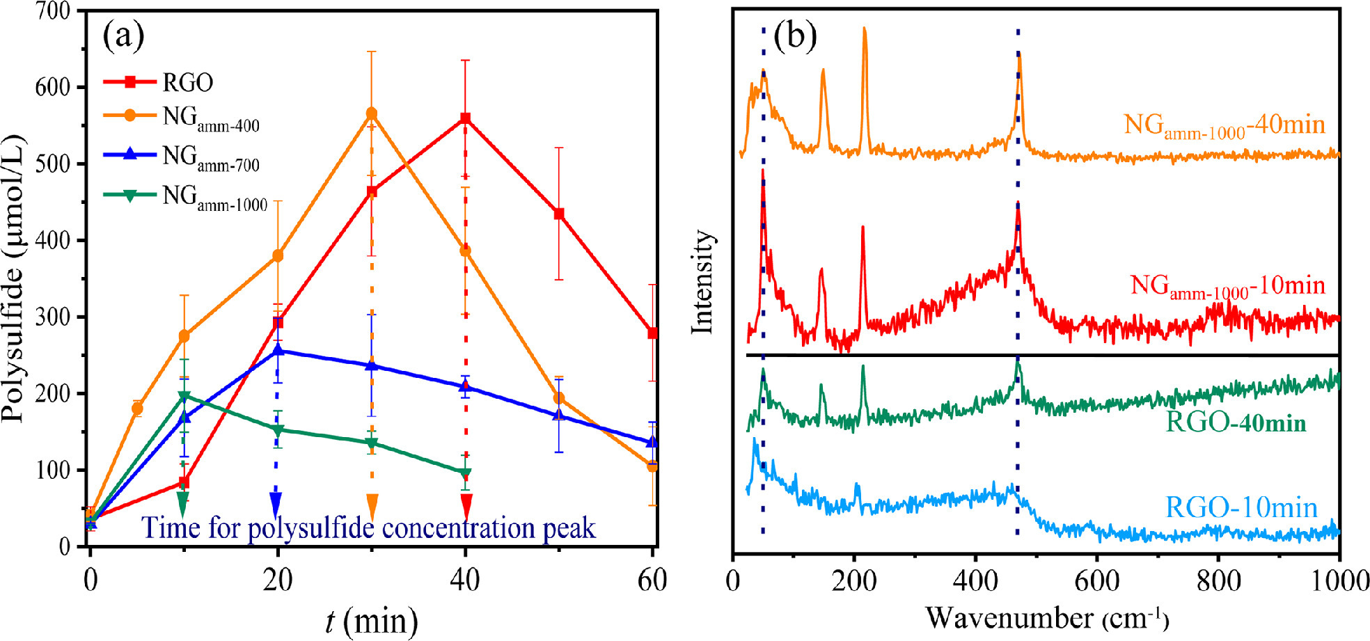 Polysulfides are key reactive intermediates of azo dye decolorization by sulfide, and it was formed by the oxidation of sulfide and can react quickly with azo dye with the formation of elemental sulfur [14]. To prove that graphene facilitates the formation of polysulfide, the reaction that separates the processes of adding sulfide and MO (MO adding after 10 min pre-reaction between sulfide and graphene) was conducted. The results in Fig. S8 (Supporting information) showed that the stagnate phase time of MO reduction significantly decreased when sulfide pre-reacted with graphene for 10 min. This may be due to that graphene facilitated the transformation from sulfide to polysulfide, which can react quickly with MO. Additionally, the formation of polysulfides in the presence of different NGs was carefully explored in this work. GC-MS was used to detect the distribution of polysulfides concentration in aqueous solutions initially. As shown in Fig. 3a, for the RGO-mediated reaction, polysulfides concentration reached a maximum value of 600 µmol/L in the first 40 min of reaction, then reduced until the reaction finished. A similar trend was found in the NGamm-mediated MO decolorization process; however, it took less time (10–30 min) for the polysulfides concentration to reach a maximum value. Nevertheless, the maximum concentration of polysulfides in NG added systems was 200-550 µmol/L, lower than that of RGO with about 550 µmol/L, which may be due to the stronger adsorption capacity of NG to polysulfides compared with RGO, which will be discussed below.