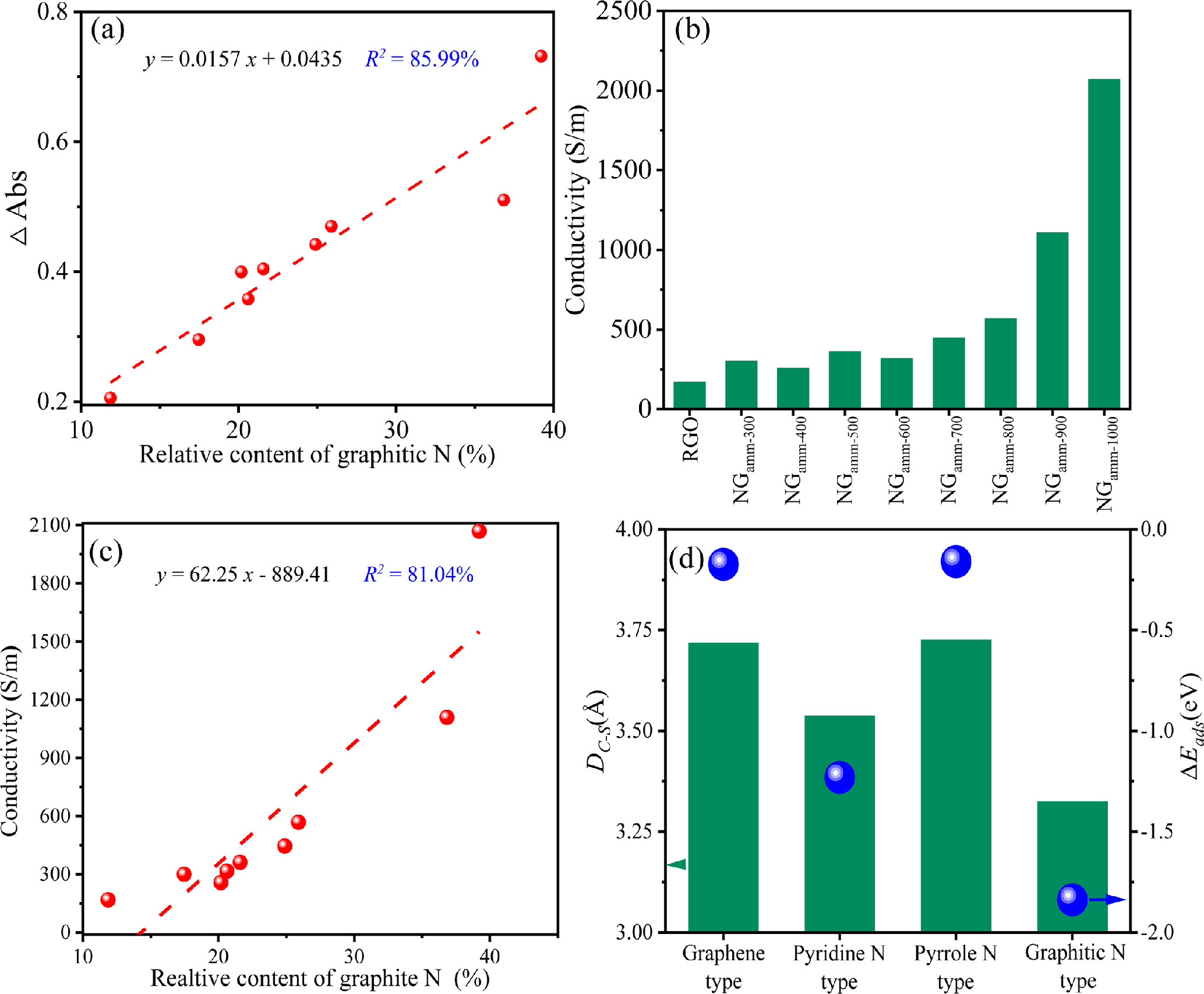 | Fig. 4. (a) Relationship between relative content of graphitic N and variation value (before and after it adsorbed by graphene) for polysulfides UV-vis absorption peak intensity at 230 nm; (b) electrical conductivity of various graphenes; (c) relationship between electrical conductivity and relative content of graphitic N for graphene; and (d) the bond length and adsorption energy of sulfide adsorbed on four kinds of graphene configurations. | |