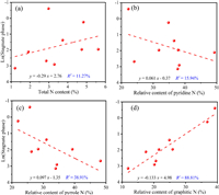 | Fig. 2. Relationship between different nitrogen species content and catalytic efficiency of graphene toward MO degradation. (a) Total N, (b) pyridine N, (c) pyrrole N, (d) graphitic N. The catalytic efficiency is represented by the logarithm of the stagnate phase for different graphene-mediated MO decolorization. | |