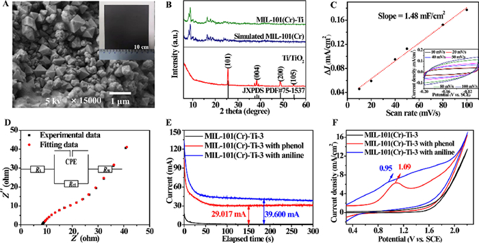 | Fig. 1. (A) SEM image and actual photo (inset) of the surface of MIL-101(Cr)-Ti-3 anode. (B) XRD patterns of different anodes. (C) Average current density (ΔJ) on MIL-101(Cr)-Ti-3 anode at −0.05 V (vs. SCE) against scan rate for the calculation of double layer capacitance (Cdl) (Inset: Cyclic voltammetry (CV) curves of MIL-101(Cr)-Ti-3 anode with different scanning rates from 10 mV/s to 100 mV/s). (D) Electrochemical impedance spectroscopy of MIL-101(Cr)-Ti-3 anode (Inset: the simplified equivalent circuit). (E) Chronoamperometric curves with and without pollutants on MIL-101(Cr)-Ti-3 anode over electrolysis time. (F) CV curves of MIL-101(Cr)-Ti-3 anode without and with the existence of phenol (or aniline). | |