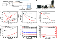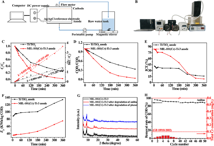 | Fig. 2. (A) Schematic diagram and (B) actual photo of the electrochemical oxidation reactor. (C) Aniline removal and corresponding kinetic fitting curves on the as-prepared anodes. (D) COD removal of the aniline solution on the as-prepared anodes. (E) Instantaneous current efficiency (ICE) and (F) energy consumption (Ep) as functions of time during aniline EO process on the as-prepared anodes. (G) XRD patterns of the freshly-prepared and used MIL-101(Cr)-Ti-3 anodes. (H) COD removal and Cr leaching concentrations using MIL-101(Cr)-Ti-3 anode for aniline removal in 50 cycles. | |