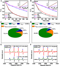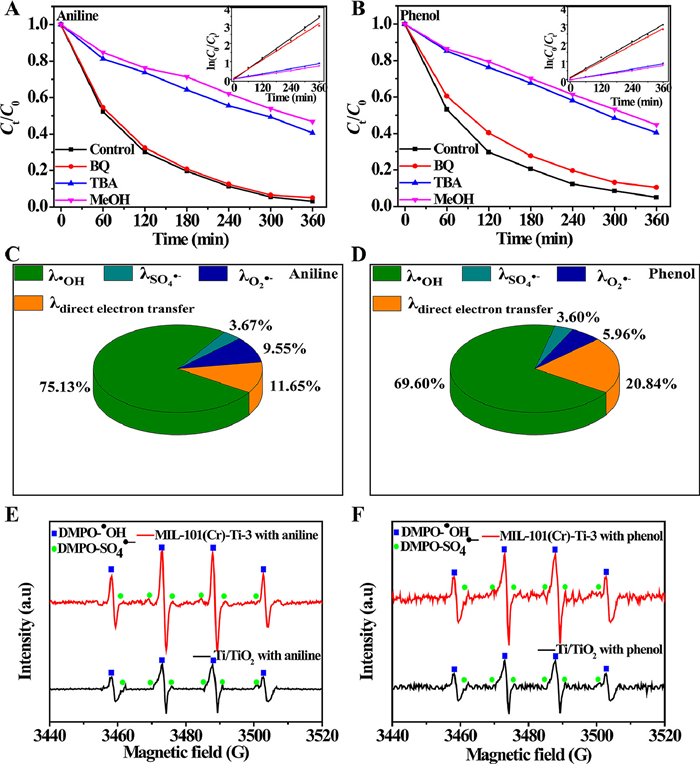 | Fig. 3. Effects of BQ, TBA and MeOH on (A) aniline and (B) phenol removal on MIL-101(Cr)-Ti-3 anode (Inset: the corresponding kinetic fitting curves). Relative contribution of •OH, SO4•−, O2•− and direct electron transfer for (C) aniline and (D) phenol removal on MIL-101(Cr)-Ti-3 anode. Electron paramagnetic resonance (EPR) signals of reactive radical after 5 min of EO processes in (E) aniline and (F) phenol solutions on MIL-101(Cr)-Ti-3 anodes. | |