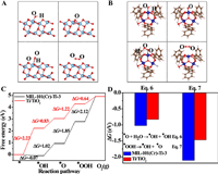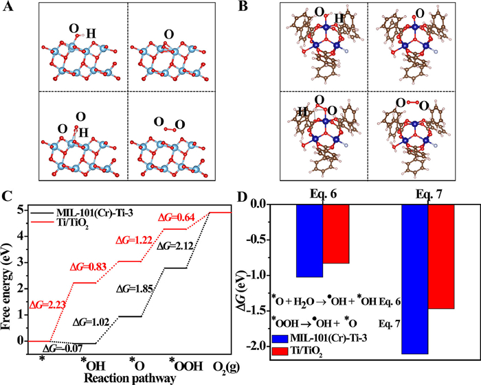 | Fig. 4. Optimized configurations of *OH, *O, *OOH and O2(g) on (A) anatase TiO2 (101) plane and (B) secondary building unit (SBU) of MIL-101(Cr) surface. (C) Free energy profiles for the OER pathway on anatase TiO2 (101) plane and SBU of MIL-101(Cr) surface. (D) Gibbs free energy variation (ΔG) of and. | |