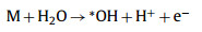 One pathway for •OH generation at the surface of metal-containing anodes (e.g., mixed metal oxide (MMO)) involves following steps: (1) H2O is adsorbed onto active site and then oxidized to adsorbed hydroxyl radicals (*OH) under external bias (Eq. 1) [11, 12]: