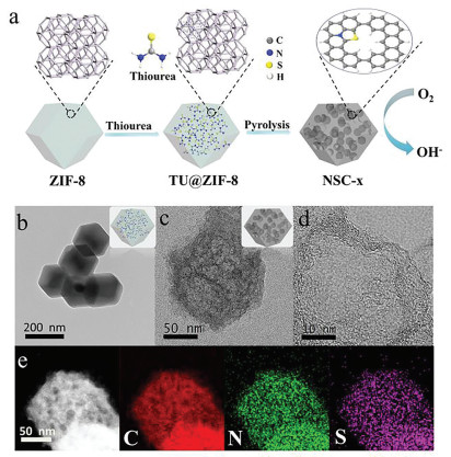 | Fig. 1. (a) Schematic illustration of the synthetic process of NSC-x catalysts. (b) TEM image of TU@ZIF-8 composite. (c, d) TEM images of NSC-10. (e) HRTEM images of NSC-10 and the corresponding elemental mapping images for C, N and S elements. | |