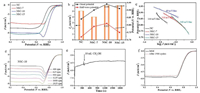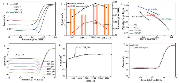 | Fig. 3. (a) LSV curves of different carbon materials in O2-saturated 0.1 mol/L KOH with a scan rate of 10 mV/s, extracting background N2 current. (b) Comparison of onset potential, half-wave potential and Jk for different catalysts. (c) Corresponding Tafel plots obtained from the LSV curves. (d) LSV curves of NSC-10 at different rotating rates from 400 rpm to 2025 rpm at a scan rate of 10 mV/s. (e) The chronoamperometric curve of NSC-10 by adding 10 mL methanol after about 400 s. (f) LSV curves of NSC-10 before and after 3500 successive cycles at a rotation rate of 1600 rpm. | |
